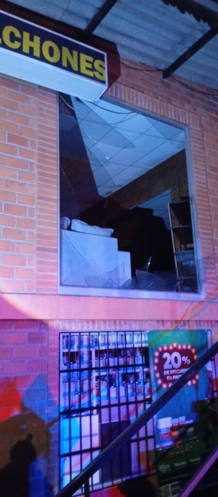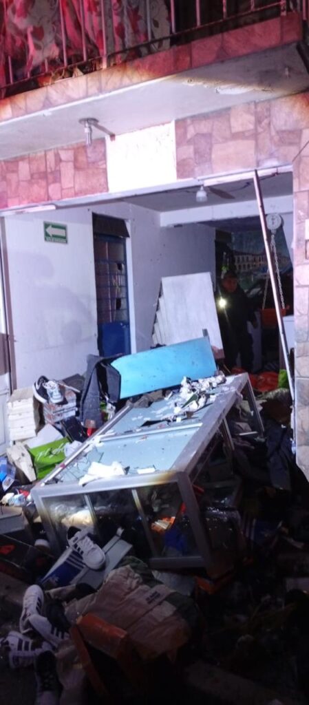 La onda expansiva alcanzó a establecimientos comerciales que se encuentran enfrente, entre estos una tienda de colchones, una más de pinturas y una de artículos chinos; en todas, las pérdidas se registran en ventanales.